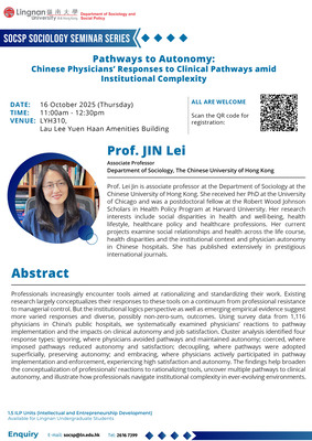Jin, L. (2025, Oct 16). Pathways to autonomy: Chinese physicians' responses to clinical pathways amid institutional complexity [Video podcast]. Retrieved from https://commons.ln.edu.hk/videos/986/